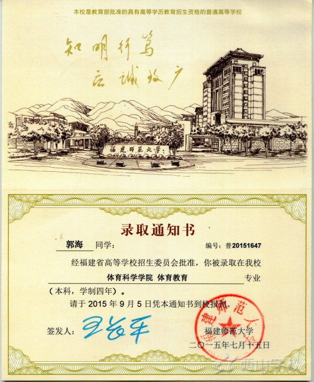 西山学校高中部2015届郭海同学被福建师范大学录取