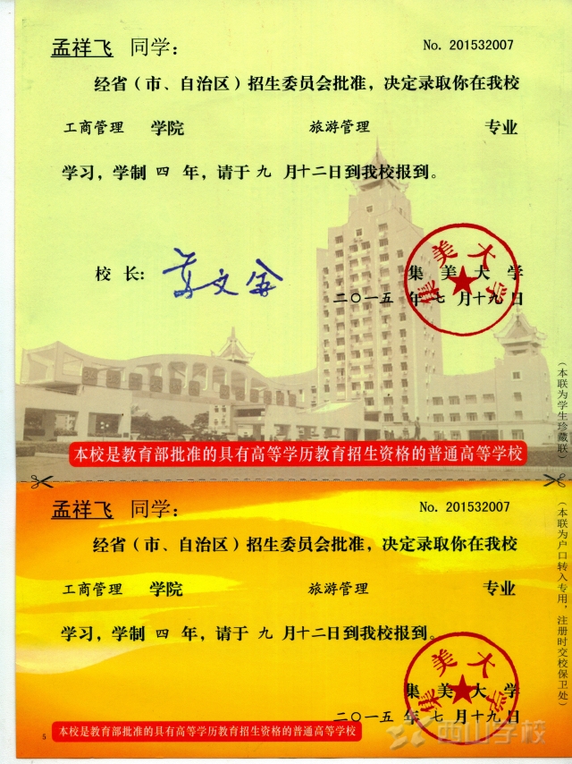 西山学校高中部2015届孟祥飞同学被集美大学录取