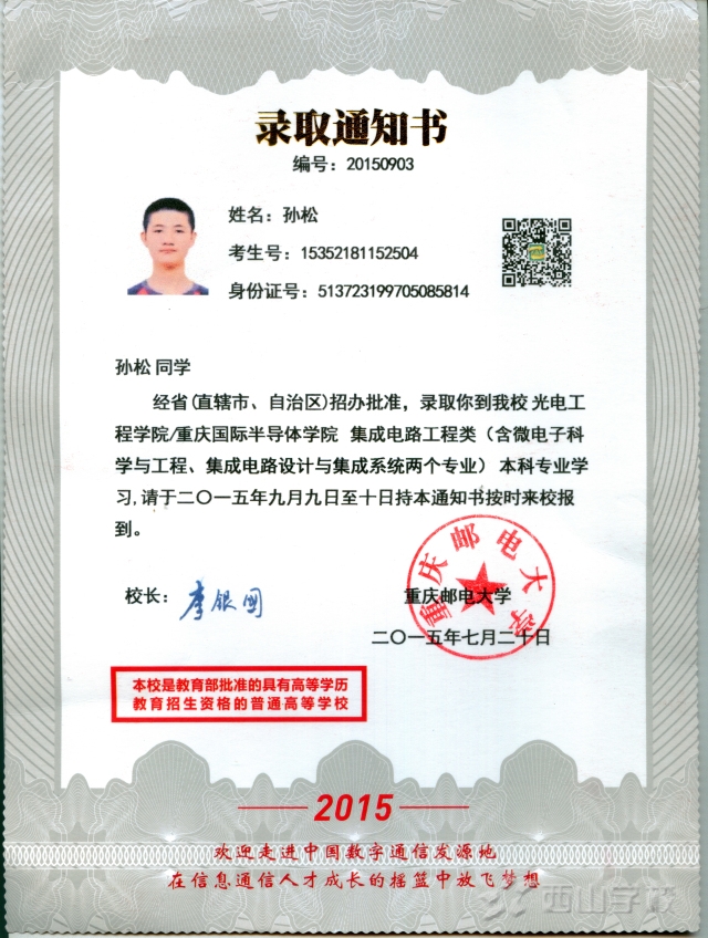 西山学校高中部2015届孙松同学被重庆邮电大学录取