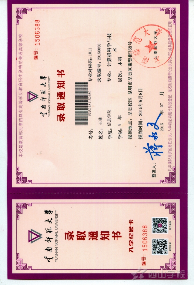 西山学校高中部2015届王林同学被云南师范大学录取
