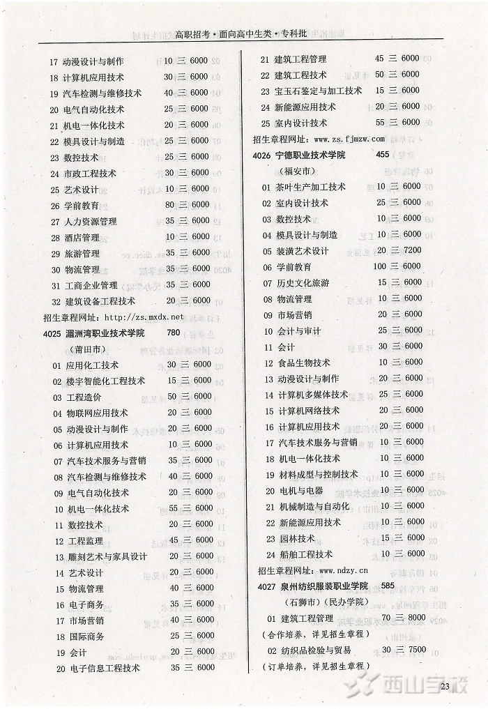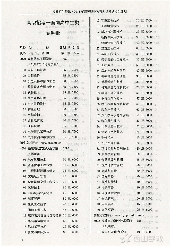 2015年福建省高职招考面向高中生类专科批招生计划