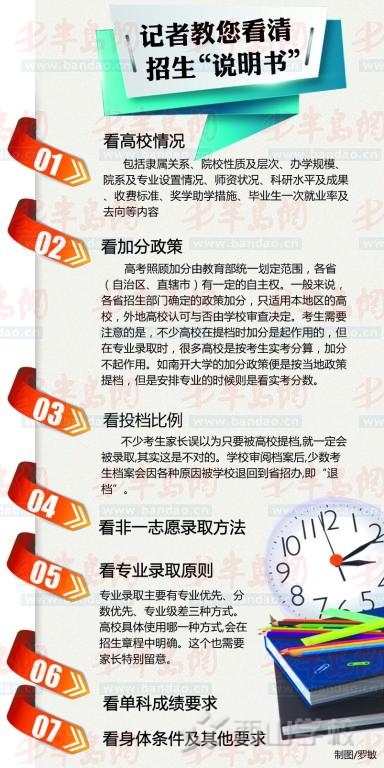 据阳光高考平台专家介绍,看高校的招生章程,至少有七点不能忽视:看高校情况;看加分政策;看投档比例;看非一志愿录取方法;看专业录取原则;看单科成绩要求;看身体条件及其他要求。