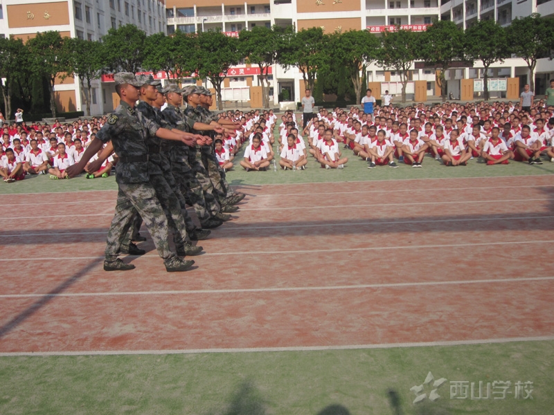 2014年8月25日上午,福清西山学校高中部举行2014级高一学生军训开幕式。中国人民解放军73307部队喻俊杰队长、总校政教处龚义彬主任、高中部赵雷校长、褚广宁副校长、庞志涛副校长、政教处赖闽玉副主任、高一年段王海波段长出席了开幕式。高一年段全体师生参加了开幕式。开幕式由学部政教处赖闽玉副主任主持。