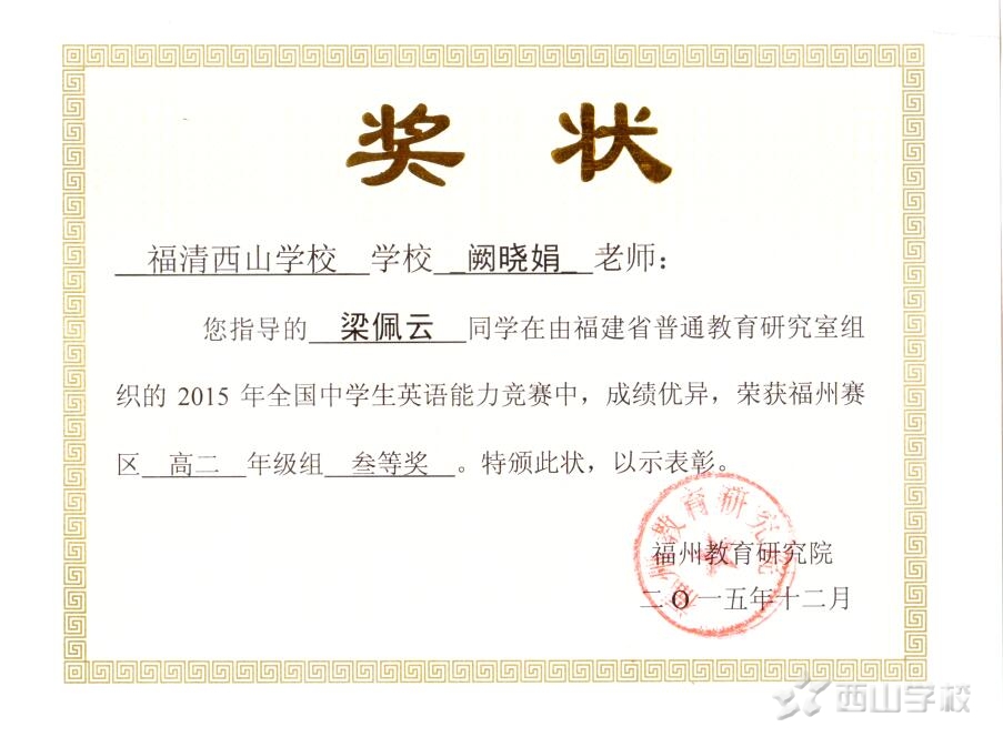 福清西山学校高中部的同学们积极参加2015年全国中学生英语能力竞赛,刘洋、梁佩云、周玮琪、秦珊珊、程媚等同学在阙晓娟、万永香、曹青青、孙敏老师的指导下,在竞赛中取得优异成绩!再此,我们再次祝贺他们!