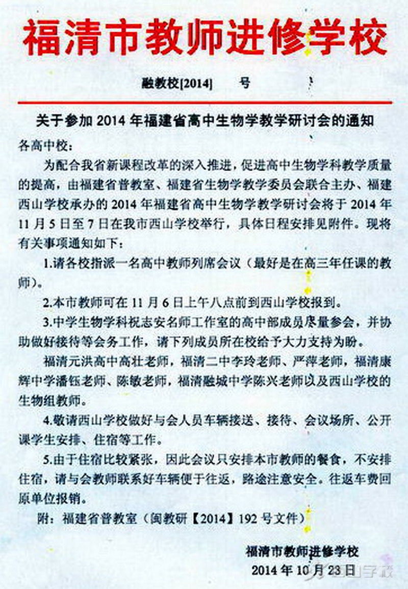 关于召开2014福建省高中生物学教学研讨会的通知