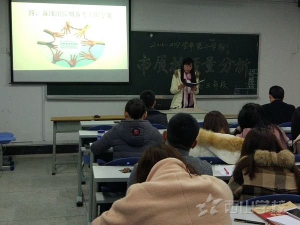 2017年3月19日晚,福建西山学校高三年段在考务室举行福州市质检质量分析会。西山学校校长赵雷、学校办公室副主任王兴华、高中部校长庞志涛、副校长赖闽玉、教务处主任何远君等领导莅临听会,会议由高三年段副段长徐光伟主持,全体高三教师参加会议。
