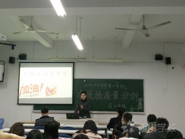 随后,高中部校长庞志涛讲话,他说:目标+行动+坚持=成功,虽然在本次质检成绩排名我们的成绩较之前有所提升,但也要看清弱势,分析班级与班级,学科与学科间的差异,抓好班风学风,开设各类专题会,鼓励学生,认真集备,在最后八十天提高教学质量,实现精讲、规范、强练、时效目标。