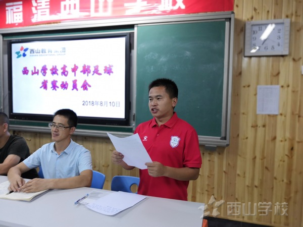 2018年8月10日晚,西山学校高中部召开2018年福建省青少年校园足球联赛暨中学生足球锦标赛赛前动员会。出席动员会的领导有:西山学校校长赵雷、西山学校体育办主任丁新、高中部校长庞志涛、副校长褚广宁、政教处主任晏荣华以及孙希然、游春粦两位教练,全体参赛队员均到场参加动员会。