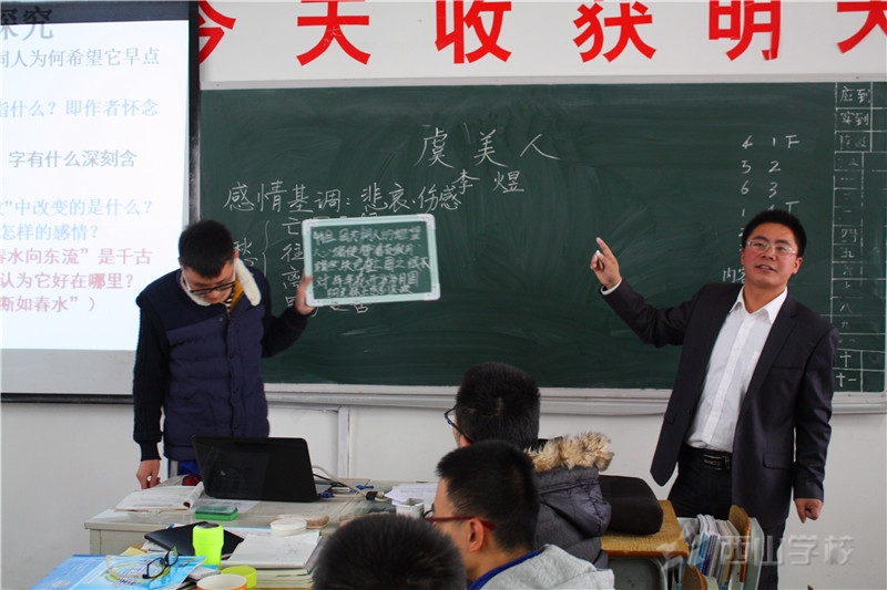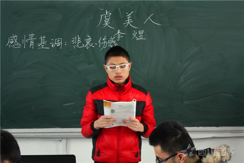 本节课讲授的是李煜的《虞美人》,伴随着优扬的音乐,詹传武老师和全班的同学们一起唱起了《虞美人》这首歌,“春花秋月何时了?往事知多少。小楼昨夜又东风,故国不堪回首月明中……”。曲折动荡,如泣如诉的歌声把词人怀旧情结和思念故国的伤痛展现得淋漓尽致。